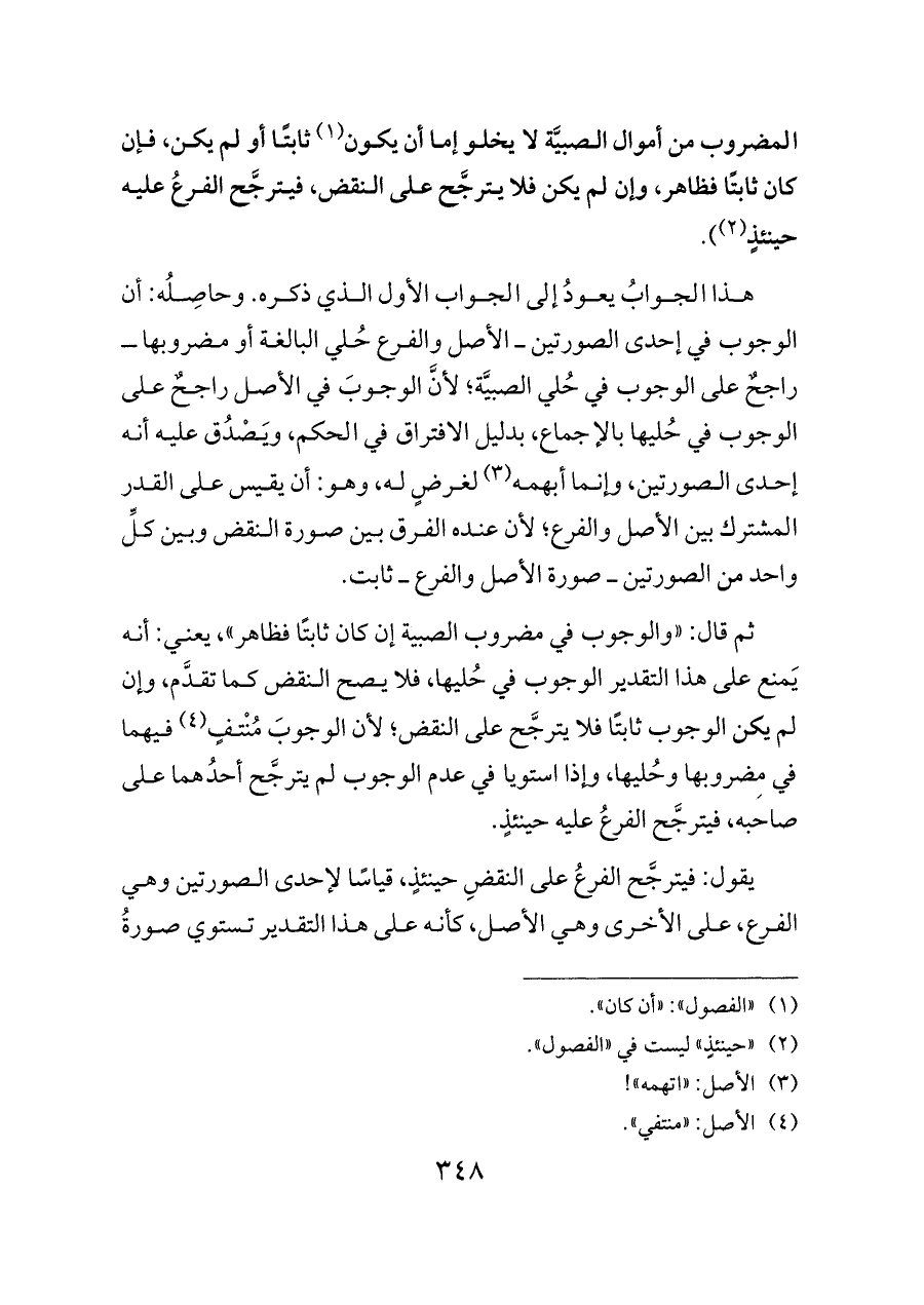 ثم قال: «والوجوب في مضروب الصبية إن كان ثابتًا فظاهر»، يعني: أنه يَمنع على هذا التقدير الوجوب في حُليها، فلا يصح النقض كما تقدَّم، وإن لم يكن الوجوب ثابتًا فلا يترجَّح على النقض؛ لأن الوجوبَ مُنْتفٍ (¬٤) فيهما في مضروبها وحُليها، وإذا استويا في عدم الوجوب لم يترجَّح أحدُهما على صاحبه، فيترجَّح الفرعُ عليه حينئذٍ.