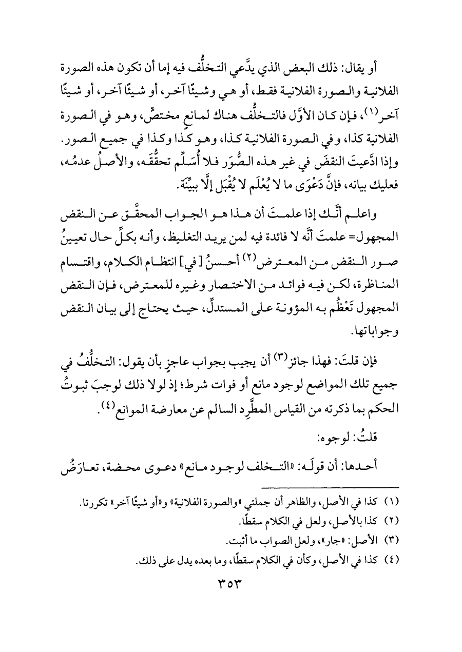 أو يقال: ذلك البعض الذي يدَّعي التخلُّف فيه إما أن تكون هذه الصورة الفلانية والصورة الفلانية فقط، أو هي وشيئًا آخر، أو شيئًا آخر، أو شيئًا آخر (¬١)، فإن كان الأوَّل فالتخلُّف هناك لمانعٍ مختصٍّ، وهو في الصورة الفلانية كذا، وفي الصورة الفلانية كذا، وهو كذا وكذا في جميع الصور. وإذا ادَّعيتَ النقضَ في غير هذه الصُّوَر فلا أُسَلِّم تحقُّقَه، والأصلُ عدمُه، فعليك بيانه، فإنَّ دَعْوَى ما لا يُعْلَم لا يُقْبَل إلَّا ببيِّنَة.