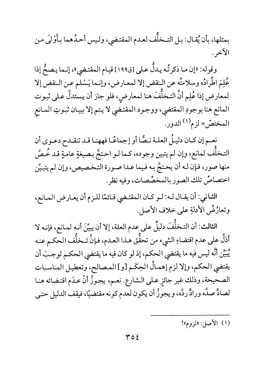 وقوله: «إن ما ذكرتُه يدلُّ على [ق ١٩٩] قيام المقتضي»، إنما يصحُّ إذا عُلِمَ اطِّرادُه وسلامتُه عن النقض إلا لمعارض، وإنما يَسْلم عن النقض إلا لمعارض إذا عُلِم أنَّ التخلُّفَ هنا لمعارضٍ، فلو جاز أن يستدلَّ على ثبوت المانع هنا بوجودِ المقتضي، ووجود المقتضي لا يتم إلا ببيان ثبوتِ المانعِ المختصّ= لزم (¬١) الدور.