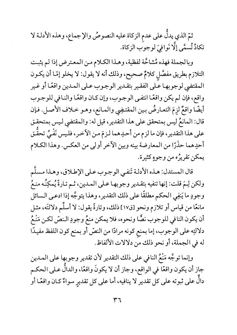 قال المستدل: هذه الأدلة تَنفي الوجوب على الإطلاق، وهذا مسلَّم ولكن لِمَ قلت: إنها تنفيه بتقدير وجوبها على المدين، ثم تارةً يُمكِنُه منعُ وجودِ ما يَنفِي الحكم مطلقًا على ذلك التقدير، وهذا يتوجَّه إذا ادعى السائل مانعًا من قياس أو تلازم ونحو [ق ١٧] ذلك، وتارةً يقول: لا أسلِّم دلالتَه، مثل أن يكون النافي للوجوب نصًّا ونحوه، فلا يمكن منعُ وجودِ النصّ لكن مَنْعُ دلالتِه على الوجوب، إما بمنعِ كونه مرادًا من النصّ أو بمنع كون اللفظ مفيدًا له في الجملة، أو نحو ذلك من دلالات الألفاظ.