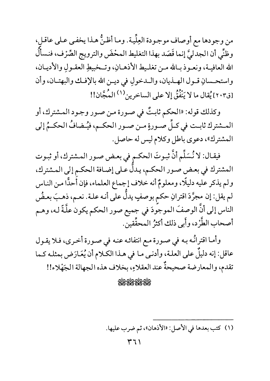 من وجودها مع أوصاف موجودة العِلِّية. وما أظنُّ هذا يخفى على عاقلٍ، وظنِّي أن الجدليَّ إنما قَصَد بهذا التغليط المحْضَ والترويج الصِّرْف، فنسألُ الله العافية، ونعوذ بالله من تغليط الأذهانِ، وتخبيطِ العقولِ والأديان، واستحسانِ قول الهذيان، والدخولِ في دين الله بالإفك والبهتان، وأن [ق ٢٠٣] يُقال ما لا يَنْفُقُ إلا على الساخرين (¬١) المُجَّان!!
