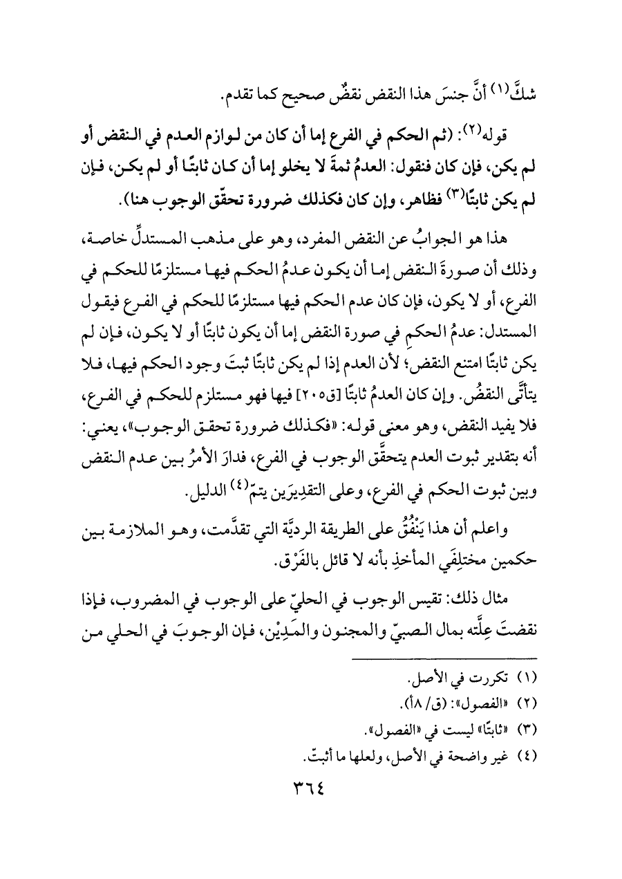 قوله (¬٢): (ثم الحكم في الفرع إما أن كان من لوازم العدم في النقض أو لم يكن، فإن كان فنقول: العدمُ ثمةَ لا يخلو إما أن كان ثابتًا أو لم يكن، فإن لم يكن ثابتًا (¬٣) فظاهر، وإن كان فكذلك ضرورة تحقّق الوجوب هنا).