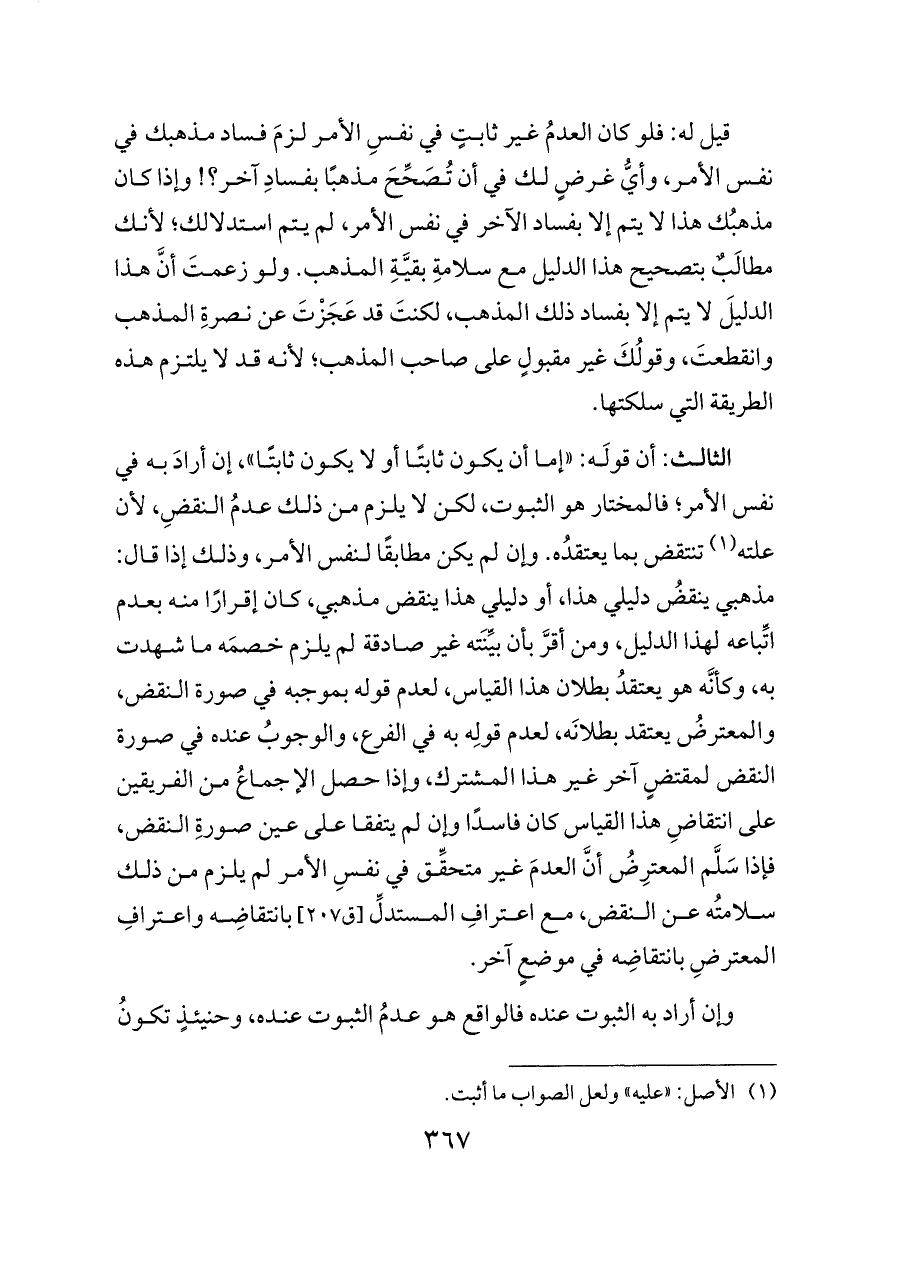 قيل له: فلو كان العدمُ غير ثابتٍ في نفسِ الأمر لزمَ فساد مذهبك في نفس الأمر، وأيُّ غرضٍ لك في أن تُصَحِّحَ مذهبًا بفسادِ آخر؟! وإذا كان مذهبُك هذا لا يتم إلا بفساد الآخر في نفس الأمر، لم يتم استدلالك؛ لأنك مطالَبٌ بتصحيح هذا الدليل مع سلامةِ بقيَّةِ المذهب. ولو زعمتَ أنَّ هذا الدليلَ لا يتم إلا بفساد ذلك المذهب، لكنتَ قد عَجَزْتَ عن نصرةِ المذهب وانقطعتَ، وقولُكَ غير مقبولٍ على صاحب المذهب؛ لأنه قد لا يلتزم هذه الطريقة التي سلكتها.
