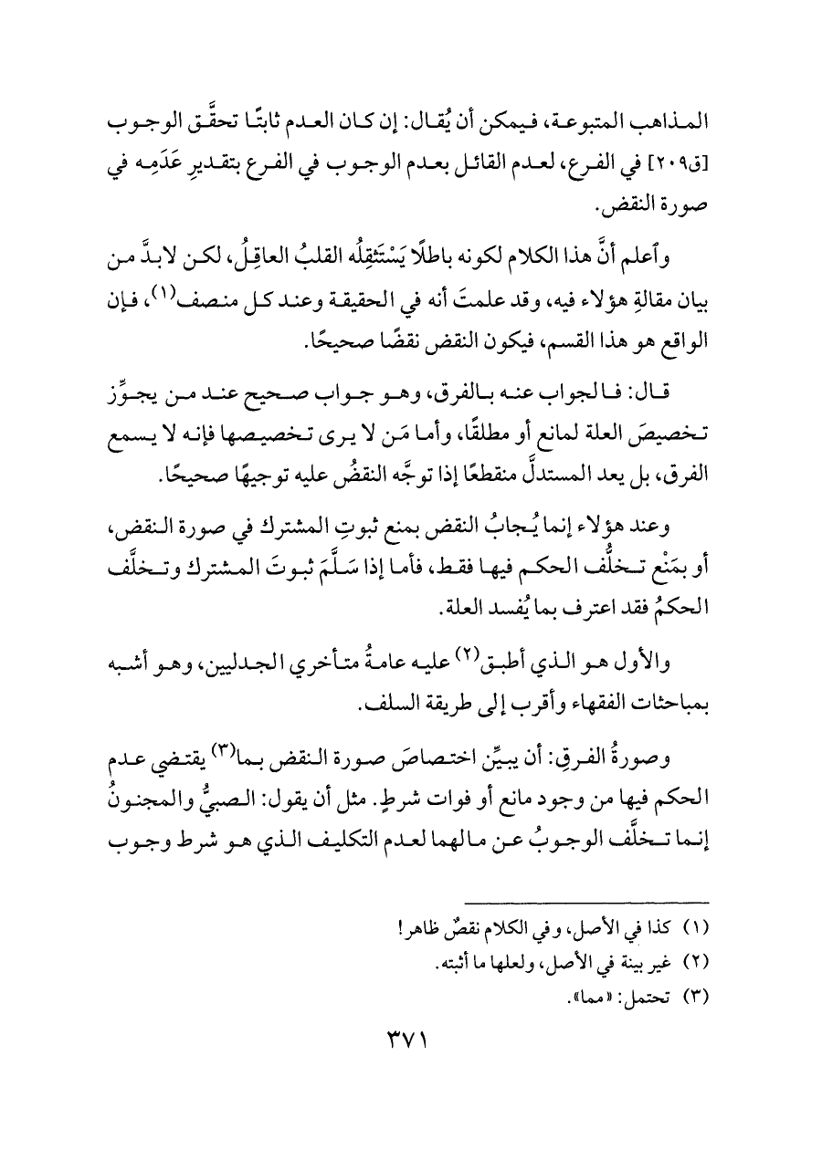 وصورةُ الفرقِ: أن يبيِّن اختصاصَ صورة النقض بما (¬٣) يقتضي عدم الحكم فيها من وجود مانع أو فوات شرطٍ. مثل أن يقول: الصبيُّ والمجنونُ إنما تخلَّف الوجوبُ عن مالهما لعدم التكليف الذي هو شرط وجوب