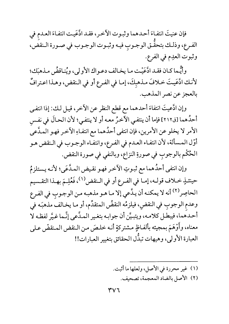 وأيُّما كان فقد ادَّعَيْت ما يخالف دعواك الأولى، ويُناقضُ مذهبَك؛ لأنك ادَّعَيتَ خلافَ مذهبِكَ، إما في الفرع أو في النقض، وهذا اعترافٌ بالعجز عن نصر المذهب.