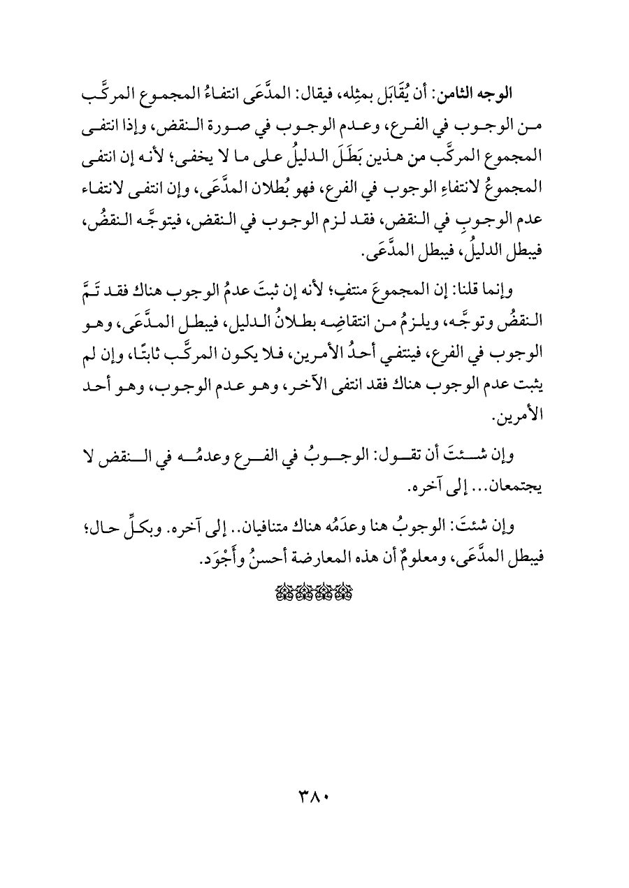 الوجه الثامن: أن يُقَابَل بمثِله، فيقال: المدَّعَى انتفاءُ المجموع المركَّب من الوجوب في الفرع، وعدم الوجوب في صورة النقض، وإذا انتفى المجموع المركَّب من هذين بَطَلَ الدليلُ على ما لا يخفى؛ لأنه إن انتفى المجموعُ لانتفاءِ الوجوب في الفرع، فهو بُطلان المدَّعَى، وإن انتفى لانتفاء عدم الوجوبِ في النقض، فقد لزم الوجوب في النقض، فيتوجَّه النقضُ، فيبطل الدليلُ، فيبطل المدَّعَى.