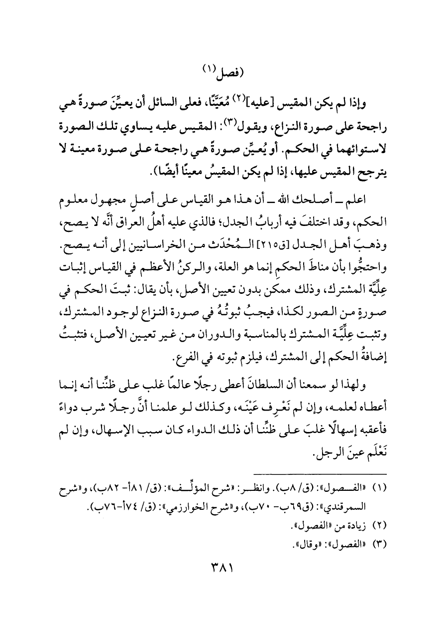 وإذا لم يكن المقيس [عليه] (¬٢) مُعَيَّنًا، فعلى السائل أن يعيِّنَ صورةً هي راجحة على صورة النزاع، ويقول (¬٣): المقيس عليه يساوي تلك الصورة لاستوائهما في الحكم. أو يُعيِّن صورةً هي راجحة على صورة معينة لا يترجح المقيس عليها، إذا لم يكن المقيسُ معينًا أيضًا).