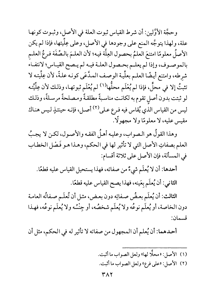 وهذا القولُ هو الصواب، وعليه أهلُ الفقه والأصول، لكن لا يجبُ العلم بصفاتِ الأصل التي لا تأثير لها في الحكم، وهذا هو فَصْل الخطاب في المسألة، فإن الأصل على ثلاثة أقسام: