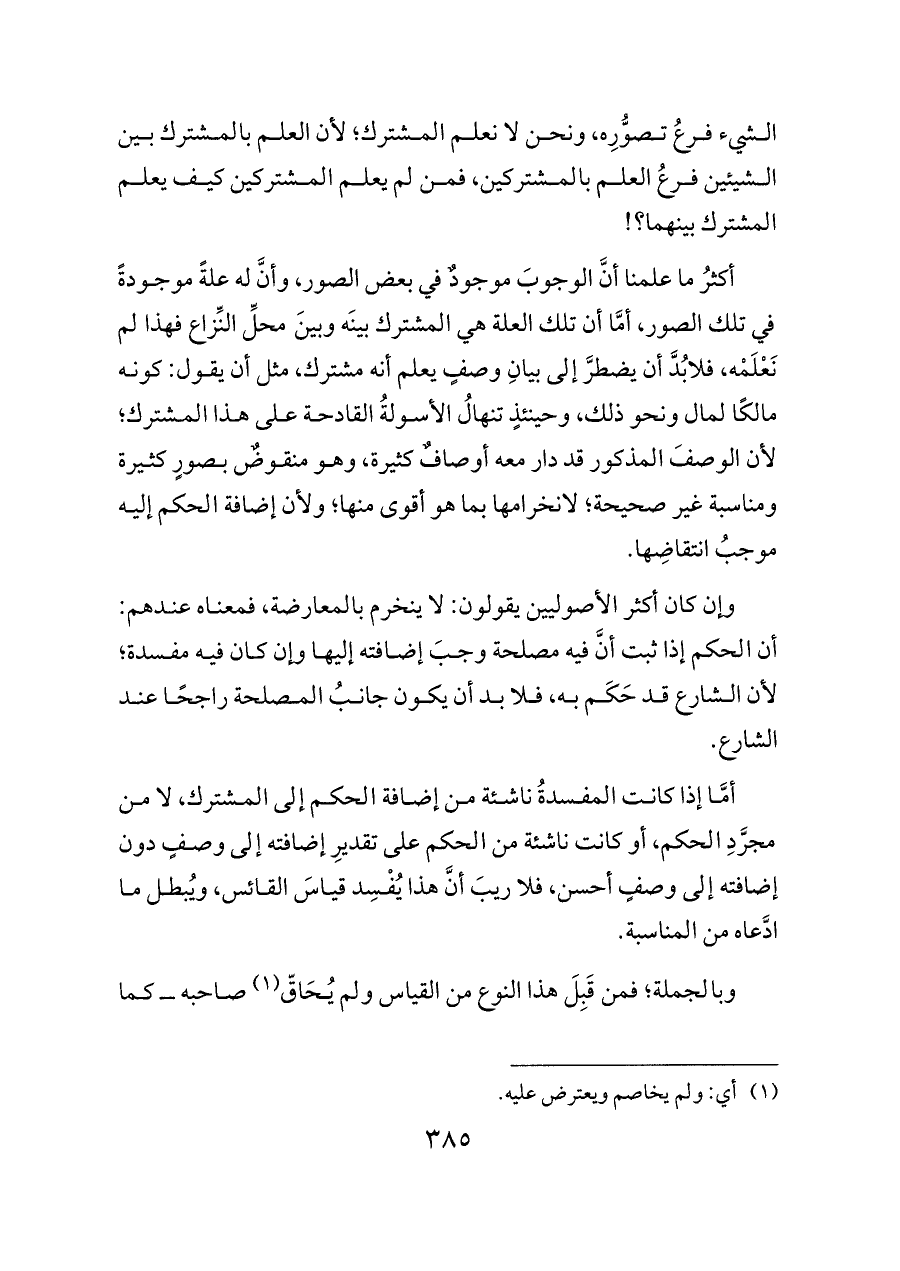 أكثرُ ما علمنا أنَّ الوجوبَ موجودٌ في بعض الصور، وأنَّ له علةً موجودةً في تلك الصور، أمَّا أن تلك العلة هي المشترك بينَه وبينَ محلِّ النِّزاع فهذا لم نَعْلَمْه، فلابُدَّ أن يضطرَّ إلى بيانِ وصفٍ يعلم أنه مشترك، مثل أن يقول: كونه مالكًا لمال ونحو ذلك، وحينئذٍ تنهالُ الأسولةُ القادحة على هذا المشترك؛ لأن الوصفَ المذكور قد دار معه أوصافٌ كثيرة، وهو منقوضٌ بصورٍ كثيرة ومناسبة غير صحيحة؛ لانخرامها بما هو أقوى منها؛ ولأن إضافة الحكم إليه موجبُ انتقاضِها.