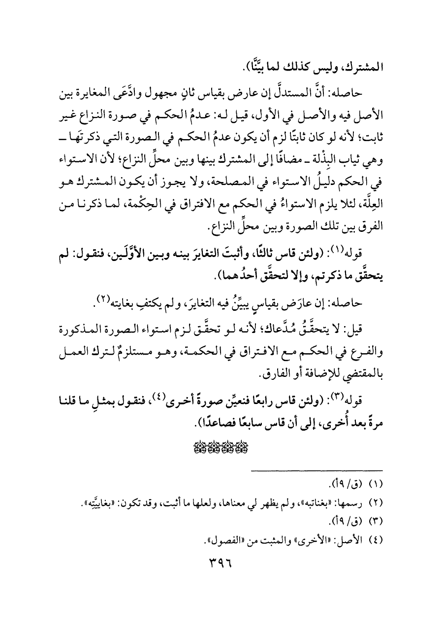 قوله (¬١): (ولئن قاس ثالثًا، وأثبتَ التغايرَ بينه وبين الأوَّلَين، فنقول: لم يتحقَّق ما ذكرتم، وإلا لتحقَّق أحدُهما).