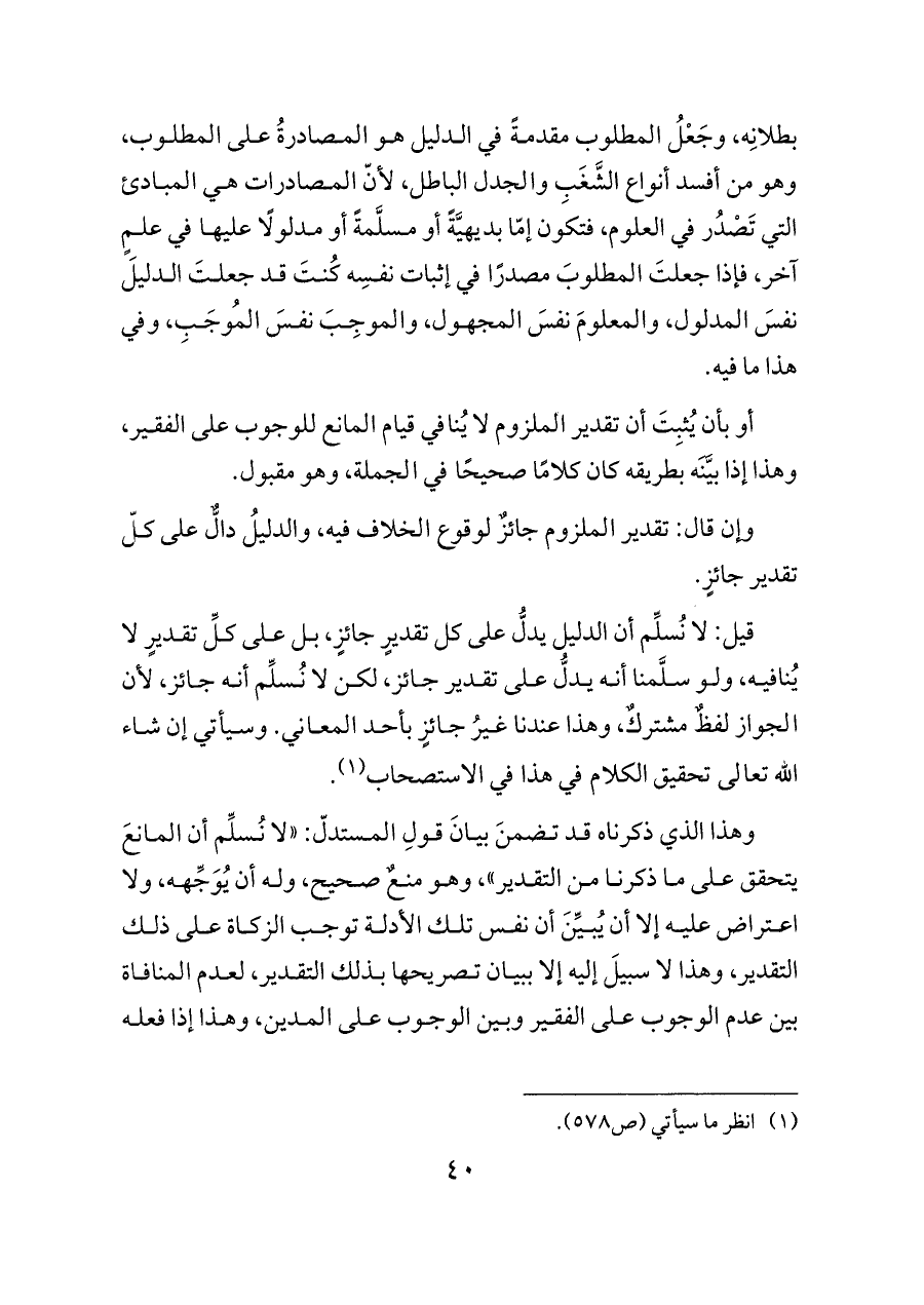 وهذا الذي ذكرناه قد تضمنَ بيانَ قولِ المستدلّ: "لا نُسلِّم أن المانعَ يتحقق على ما ذكرنا من التقدير"، وهو منعٌ صحيح، وله أن يُوَجِّهه، ولا اعتراض عليه إلا أن يُبيِّنَ أن نفس تلك الأدلة توجب الزكاة على ذلك التقدير، وهذا لا سبيلَ إليه إلا ببيان تصريحها بذلك التقدير، لعدم المنافاة بين عدم الوجوب على الفقير وبين الوجوب على المدين، وهذا إذا فعله