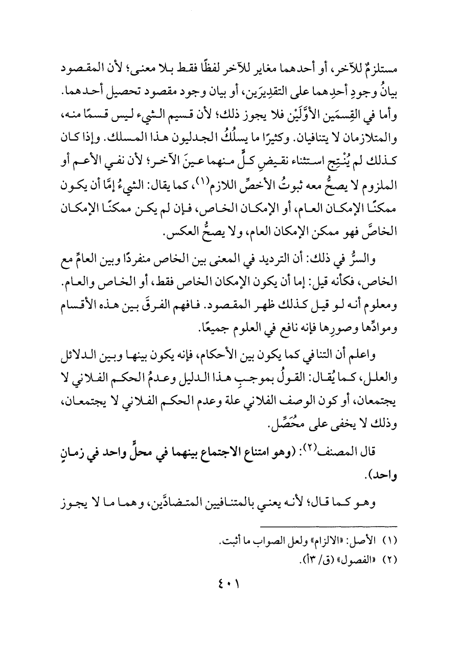 مستلزمٌ للآخر، أو أحدهما مغاير للآخر لفظًا فقط بلا معنى؛ لأن المقصود بيانُ وجودِ أحدِهما على التقدِيرَين، أو بيان وجود مقصود تحصيل أحدهما. وأما في القِسمَين الأوَّلَيْن فلا يجوز ذلك؛ لأن قسيم الشيء ليس قسمًا منه، والمتلازمان لا يتنافيان. وكثيرًا ما يسلُكُ الجدليون هذا المسلك. وإذا كان كذلك لم يُنْتِج استثناء نقيضِ كلٍّ منهما عينَ الآخر؛ لأن نفي الأعم أو الملزوم لا يصحُّ معه ثبوتُ الأخصِّ اللازم (¬١)، كما يقال: الشيءُ إمَّا أن يكون ممكنًا الإمكان العام، أو الإمكان الخاص، فإن لم يكن ممكنًا الإمكان الخاصَّ فهو ممكن الإمكان العام، ولا يصحُّ العكس.