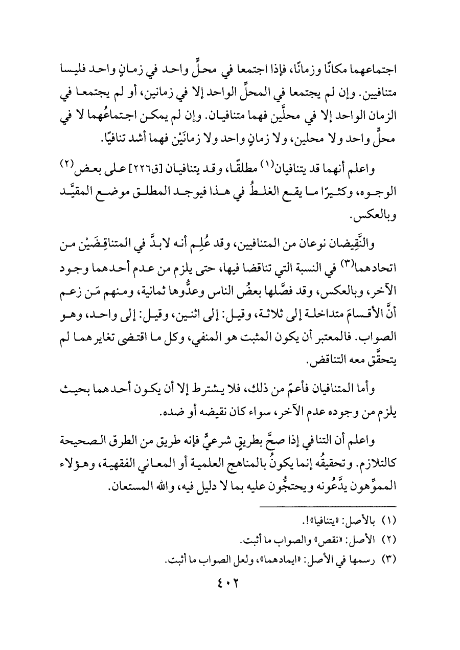 واعلم أن التنافي إذا صحَّ بطريقٍ شرعيٍّ فإنه طريق من الطرق الصحيحة كالتلازم. وتحقيقُه إنما يكونُ بالمناهج العلمية أو المعاني الفقهية، وهؤلاء المموِّهون يدَّعُونه ويحتجُّون عليه بما لا دليل فيه، والله المستعان.