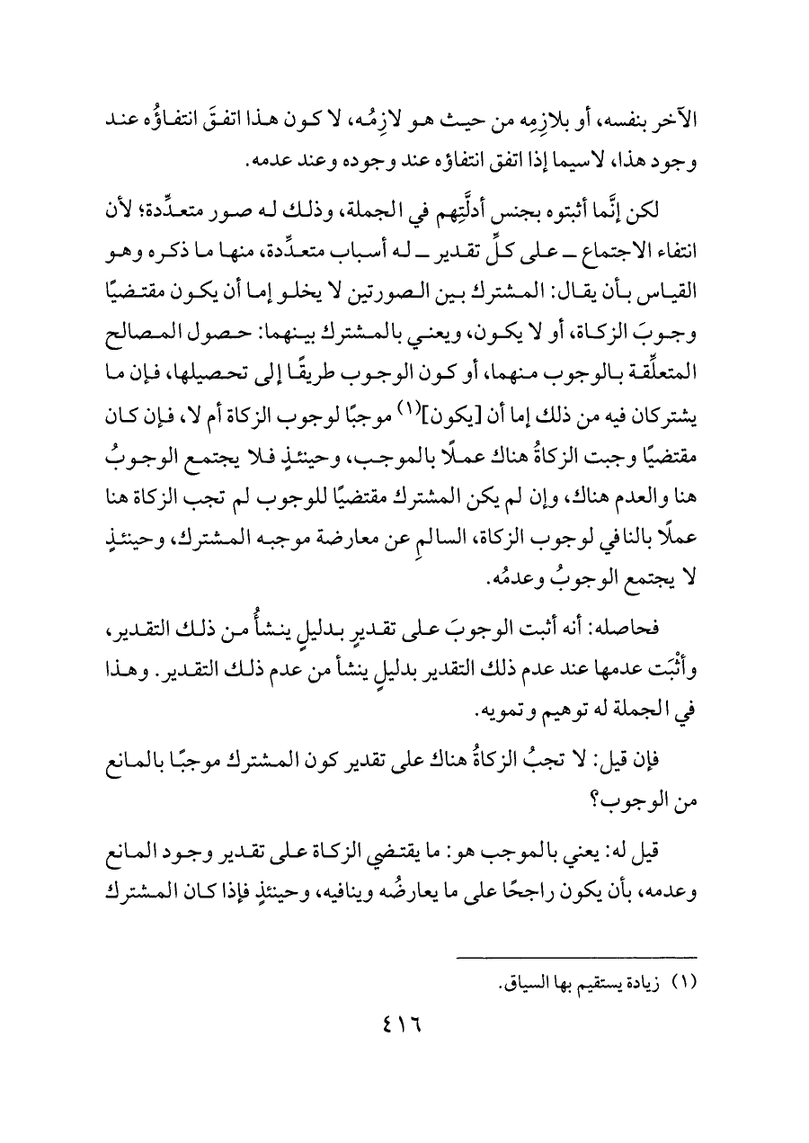 لكن إنَّما أثبتوه بجنس أدلَّتِهم في الجملة، وذلك له صور متعدِّدة؛ لأن انتفاء الاجتماع ــ على كلِّ تقدير ــ له أسباب متعدِّدة، منها ما ذكره وهو القياس بأن يقال: المشترك بين الصورتين لا يخلو إما أن يكون مقتضيًا وجوبَ الزكاة، أو لا يكون، ويعني بالمشترك بينهما: حصول المصالح المتعلِّقة بالوجوب منهما، أو كون الوجوب طريقًا إلى تحصيلها، فإن ما يشتركان فيه من ذلك إما أن [يكون] (¬١) موجبًا لوجوب الزكاة أم لا، فإن كان مقتضيًا وجبت الزكاةُ هناك عملًا بالموجب، وحينئذٍ فلا يجتمع الوجوبُ هنا والعدم هناك، وإن لم يكن المشترك مقتضيًا للوجوب لم تجب الزكاة هنا عملًا بالنافي لوجوب الزكاة، السالمِ عن معارضة موجبه المشترك، وحينئذٍ لا يجتمع الوجوبُ وعدمُه.