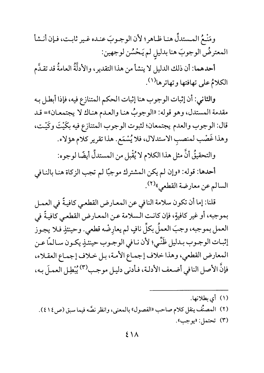 قلنا: إما أن تكون سلامة النافي عن المعارض القطعي كافيةً في العمل بموجبه، أو غير كافيةٍ، فإن كانت السلامة عن المعارض القطعي كافيةً في العمل بموجبه، وجبَ العملُ بكلِّ نافٍ لم يعارِضْه قطعي. وحينئذٍ فلا يجوز إثبات الوجوب بدليل ظَنِّي؛ لأن نافي الوجوب حينئذٍ يكون سالمًا عن المعارض القطعي، وهذا خلاف إجماع الأمة، بل خلاف إجماع العقلاء، فإنَّ الأصل النافي أضعف الأدلة، فأدنى دليل موجب (¬٣) يُبْطِل العملَ به،