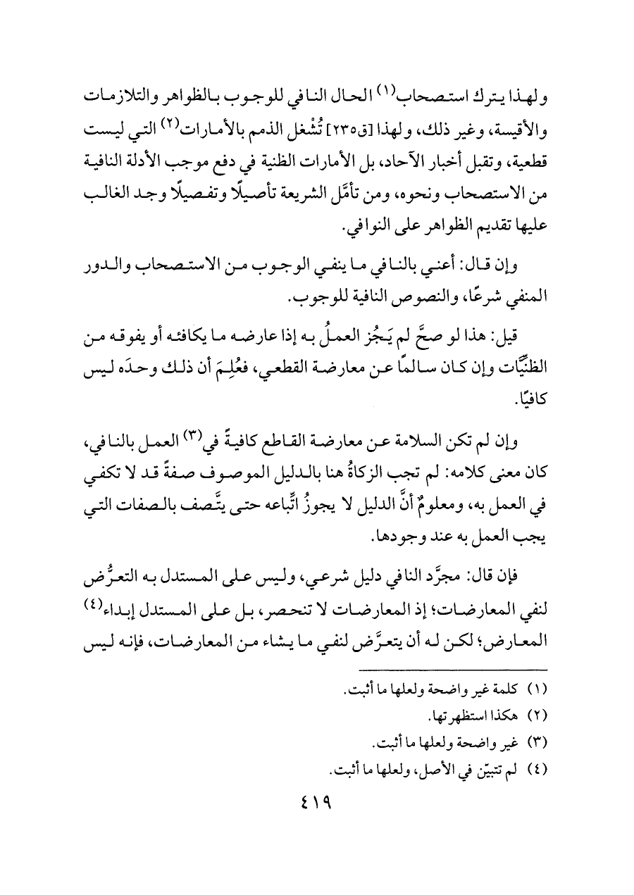 وإن قال: أعني بالنافي ما ينفي الوجوب من الاستصحاب والدور المنفي شرعًا، والنصوص النافية للوجوب.