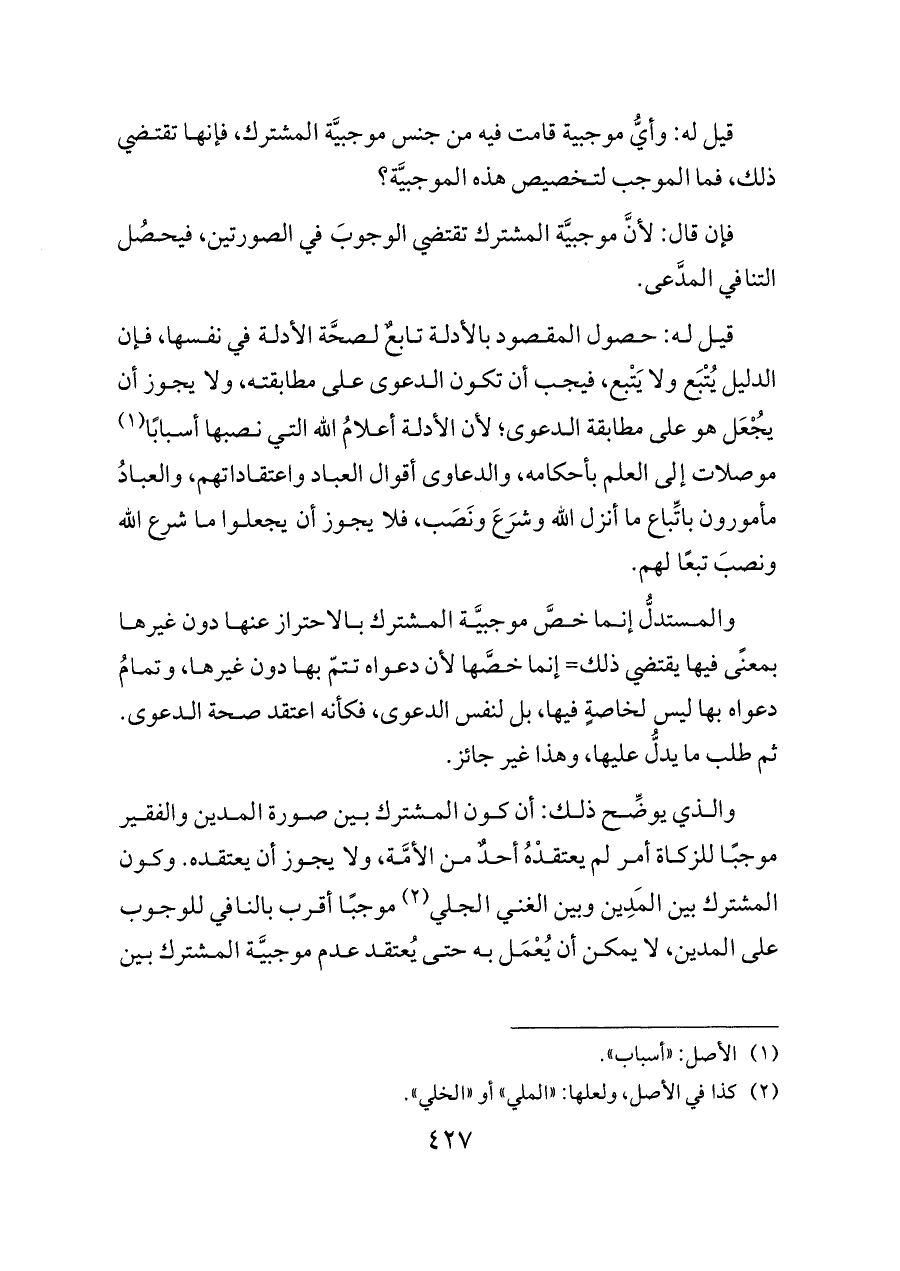 والذي يوضِّح ذلك: أن كون المشترك بين صورة المدين والفقير موجبًا للزكاة أمر لم يعتقدْهُ أحدٌ من الأمَّة، ولا يجوز أن يعتقده. وكون المشترك بين المَدِين وبين الغني الجلي (¬٢) موجبًا أقرب بالنافي للوجوب على المدين، لا يمكن أن يُعْمَل به حتى يُعتقد عدم موجبيَّة المشترك بين