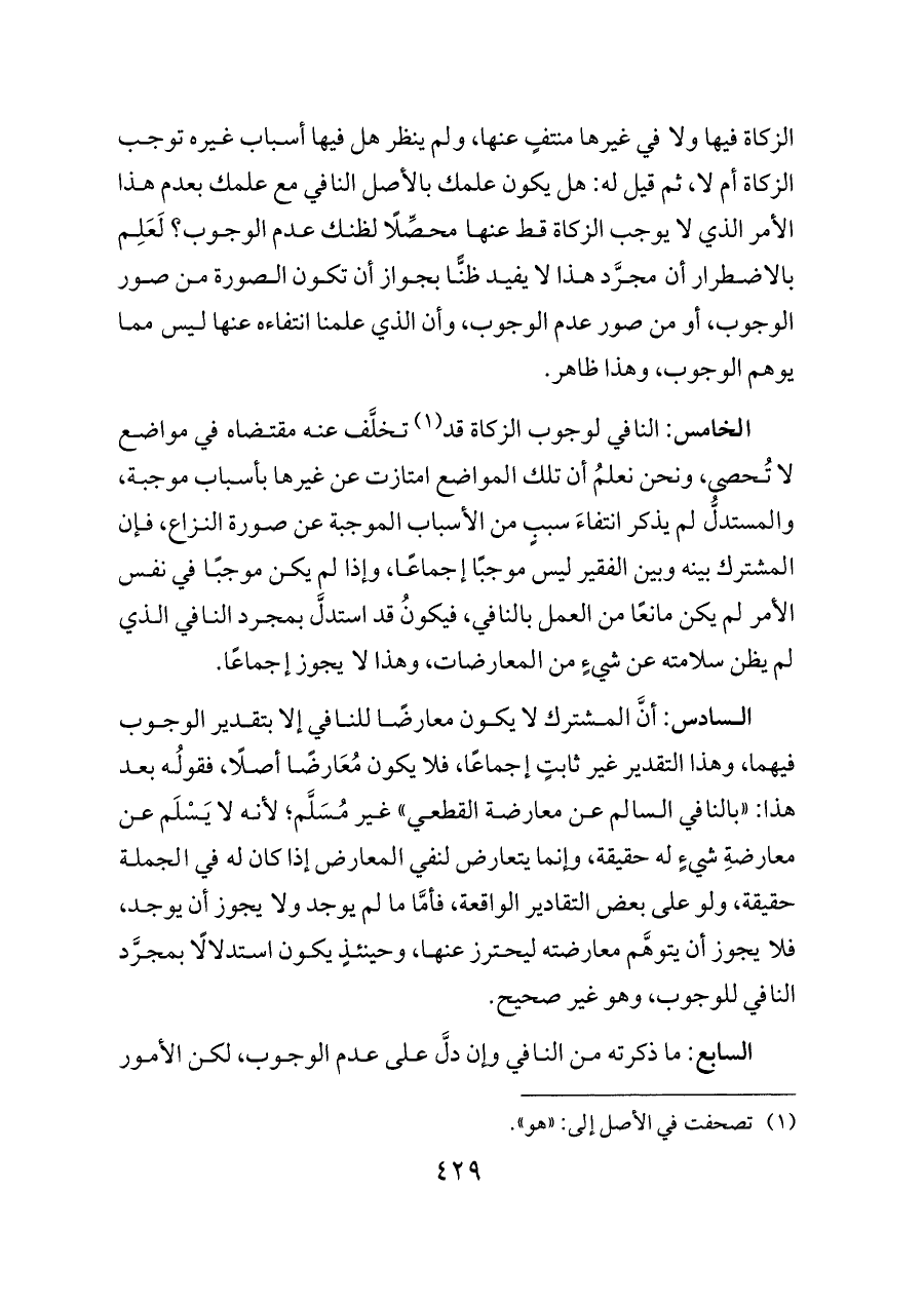الخامس: النافي لوجوب الزكاة قد (¬١) تخلَّف عنه مقتضاه في مواضع لا تُحصى، ونحن نعلمُ أن تلك المواضع امتازت عن غيرها بأسباب موجبة، والمستدلُّ لم يذكر انتفاءَ سببٍ من الأسباب الموجبة عن صورة النزاع، فإن المشترك بينه وبين الفقير ليس موجبًا إجماعًا، وإذا لم يكن موجبًا في نفس الأمر لم يكن مانعًا من العمل بالنافي، فيكونُ قد استدلَّ بمجرد النافي الذي لم يظن سلامته عن شيءٍ من المعارضات، وهذا لا يجوز إجماعًا.
