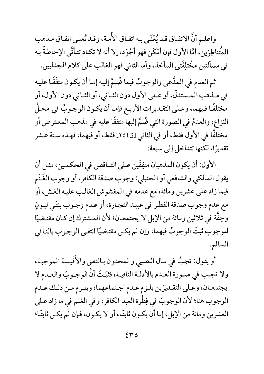 أو يقول: تجبُ في مال الصبي والمجنون بالنص والأَقْيسة الموجبة، ولا تجب في صورة العدم بالأدلة النافية، فثبَتَ أنَّ الوجوبَ والعدم لا يجتمعان، وعلى التقديرَين يلزم عدم اجتماعهما، ويلزم من ذلك عدم الوجوب هنا؛ لأن الوجوبَ في فِطْرة العبد الكافر، وفي الغنم في ما زاد على العشرين ومائة من الإبل، إما أن يكون ثابتًا، أو لا يكون، فإن لم يكن ثابتًا؛