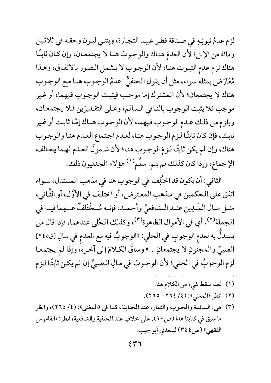 الثاني: أن يكون قد اختُلِف في الوجوب هنا في مذهب المستدل، سواء اتفق على الحكمين في مذهب المعترض، أو اختلف في الأوَّل، أو الثَّاني، مثل مال المَدِين عند الشافعيِّ وأحمد، فإنه مُخْتَلفٌ عنهما فيه في الجملة (¬٢)، أي في الأموال الظاهرة (¬٣)، وكذلك الحُلي عندهما، فإذا قال من يستدلُّ به لعدمِ الوجوبِ في الحلي: «الوجوبُ فيه مع العدمِ في مالِ [ق ٢٤٥] الصبيِّ والمجنونِ لا يجتمعانِ ... » وساقَ الكلامَ إلى آخره، وإذا لم يجتمعا لزم الوجوبُ في الحلي؛ لأن الوجوبَ في مالِ الصبيِّ إن لم يكن ثابتًا لزم