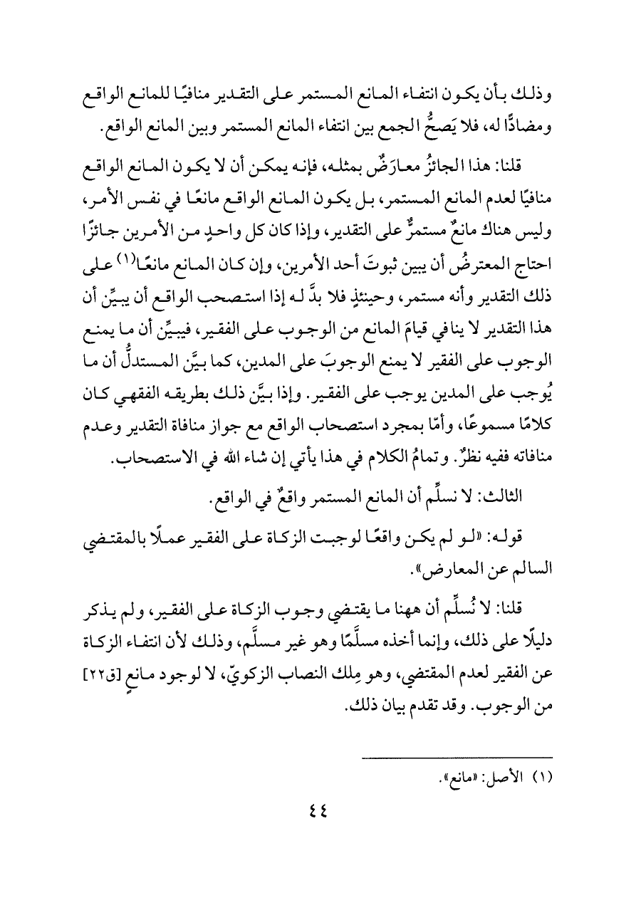 قلنا: هذا الجائزُ معارَضٌ بمثله، فإنه يمكن أن لا يكون المانع الواقع منافيًا لعدم المانع المستمر، بل يكون المانع الواقع مانعًا في نفس الأمر، وليس هناك مانعٌ مستمرٌّ على التقدير، وإذا كان كل واحدٍ من الأمرين جائزًا احتاج المعترضُ أن يبين ثبوتَ أحد الأمرين، وإن كان المانع مانعًا (¬١) على ذلك التقدير وأنه مستمر، وحينئذٍ فلا بدَّ له إذا استصحب الواقع أن يبيِّن أن هذا التقدير لا ينافي قيامَ المانع من الوجوب على الفقير، فيبيِّن أن ما يمنع الوجوب على الفقير لا يمنع الوجوبَ على المدين، كما بيَّن المستدلُّ أن ما يُوجب على المدين يوجب على الفقير. وإذا بيَّن ذلك بطريقه الفقهي كان كلامًا مسموعًا، وأمّا بمجرد استصحاب الواقع مع جواز منافاة التقدير وعدم منافاته ففيه نظرٌ. وتمامُ الكلام في هذا يأتي إن شاء الله في الاستصحاب.