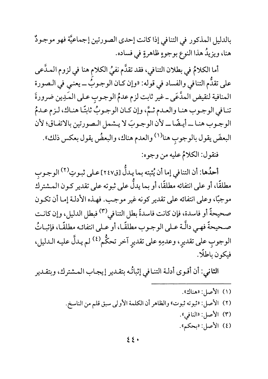 أحدُها: أن التنافي إما أن يُثبته بما يدلُّ [ق ٢٤٧] على ثبوتِ (¬٢) الوجوبِ مطلقًا، أو على انتفائه مطلقًا، أو بما يدلُّ على ثبوته على تقدير كون المشترك موجبًا، وعلى انتفائه على تقدير كونه غير موجب. فهذه الأدلة إما أن تكون صحيحةً أو فاسدة، فإن كانت فاسدةً بطل التنافي (¬٣) فبطل الدليل، وإن كانت صحيحةً فهي دالَّة على الوجوب مطلقًا، أو على انتفائه مطلقًا، فإثباتُ الوجوبِ على تقديرٍ، وعدمِهِ على تقديرٍ آخر تحكُّم (¬٤) لم يدلَّ عليه الدليل، فيكون باطلًا.