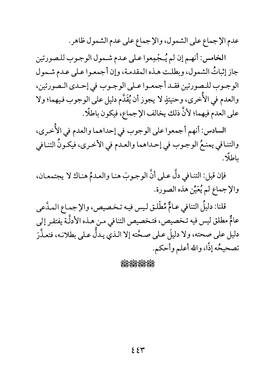 الخامس: أنهم إن لم يُجْمِعوا على عدم شمول الوجوب للصورتين جاز إثباتُ الشمول، وبطلت هذه المقدمة، وإن أجمعوا على عدم شمول الوجوب للصورتين فقد أجمعوا على الوجوب في إحدى الصورتين، والعدم في الأُخرى، وحنيئذٍ لا يجوز أن يُقَدَّم دليل على الوجوب فيهما؛ ولا على العدم فيهما؛ لأنَّ ذلك يخالف الإجماع، فيكون باطلًا.