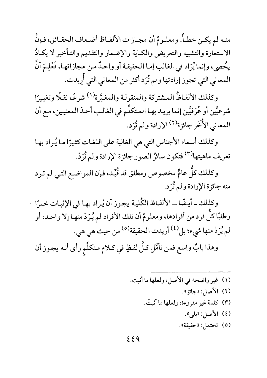 وكذلك ــ أيضًا ــ الألفاظ الكُلية يجوز أن يُراد بها في الإثبات خبرًا وطلبًا كلُّ فرد من أفرادها، ومعلومٌ أن تلك الأفراد لم يُرَدْ منها إلا واحد، أو لم يُرَدْ منها شيء؛ بل (¬٤) أريدت الحقيقة (¬٥) من حيث هي هي.