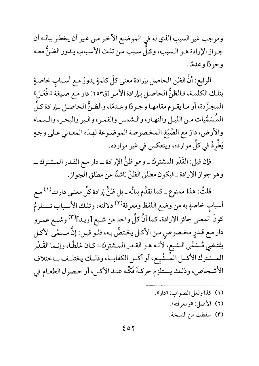 قلتُ: هذا ممنوع ــ كما تقدَّم بيانُه ــ بل ظنُّ إرادة كلِّ معنى دارت (¬١) مع أسبابٍ خاصةٍ به من وضع اللفظ ومعرفة (¬٢) دلالته، وتلك الأسباب تستلزمُ كونَ المعنى جائز الإرادة، كما أنَّ كلَّ واحد من شبع [زيد] (¬٣) وشبع عمرو دار مع قدرٍ مخصوصٍ من الأكل يختصُّ به، فلو قيل: إنَّ مسمَّى الأكل يقتضي مُسَمَّى الشبع، لأنه هو القدر المشترك= كان غلطًا، وإنما القَدْر المشترك الأكل المُشْبِع، أو أكل الكفاية، وذلك يختلف باختلاف الأشخاص، وذلك يستلزم حركةَ فَكِّه عند الأكل، أو حصول الطعام