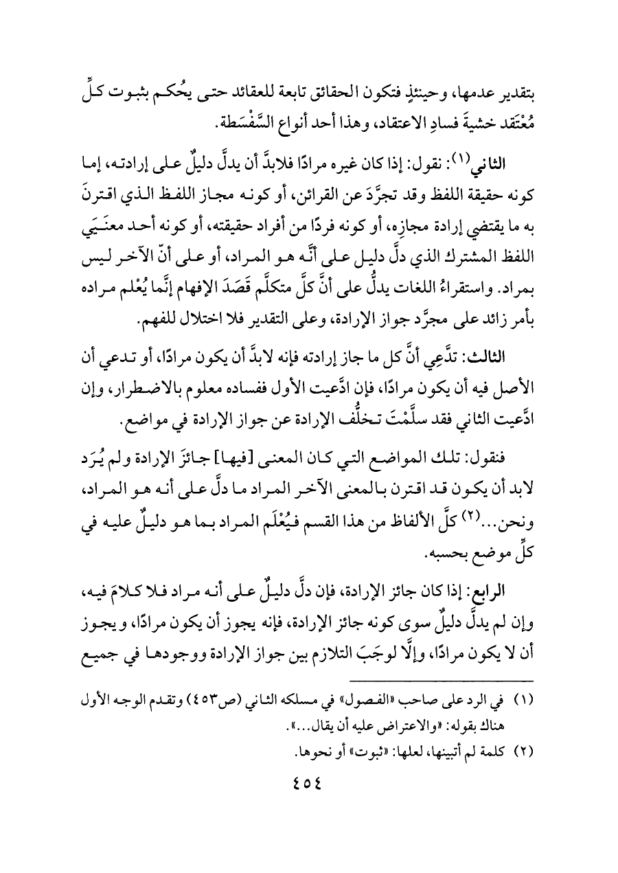الثالث: تدَّعِي أنَّ كل ما جاز إرادته فإنه لابدَّ أن يكون مرادًا، أو تدعي أن الأصل فيه أن يكون مرادًا، فإن ادَّعيت الأول ففساده معلوم بالاضطرار، وإن ادَّعيت الثاني فقد سلَّمْتَ تخلُّف الإرادة عن جواز الإرادة في مواضع.