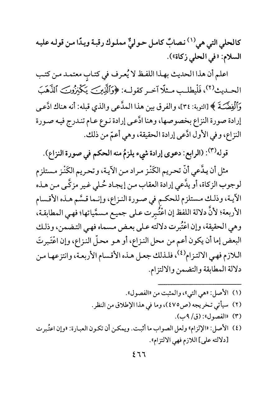 مثل أن يدَّعي أنّ تحريم الكَنْز مراد من الآية، وتحريم الكَنْز مستلزم لوجوب الزكاة، أو يدَّعي إرادة العقاب من إيجاد حُلي غير مزكَّى من هذه الآية، وذلك مستلزم للحكمِ في صورة النزاع، وإنما قسَّم هذه الأقسام الأربعة؛ لأنَّ دلالة اللفظ إن اعْتُبِرت على جميع مسمَّياتها؛ فهي المطابقة، وهي الحقيقة، وإن اعْتُبرت دلالته على بعض مسماه فهي التضمن، وذلك البعض إما أن يكون أعم من محل النزاع، أو هو محلّ النزاع، وإن اعْتَبرتَ اللازم فهي الالتزام (¬٤)، فلذلك جعل هذه الأقسام الأربعة، وانتزعها من دلالة المطابقة والتضمن والالتزام.