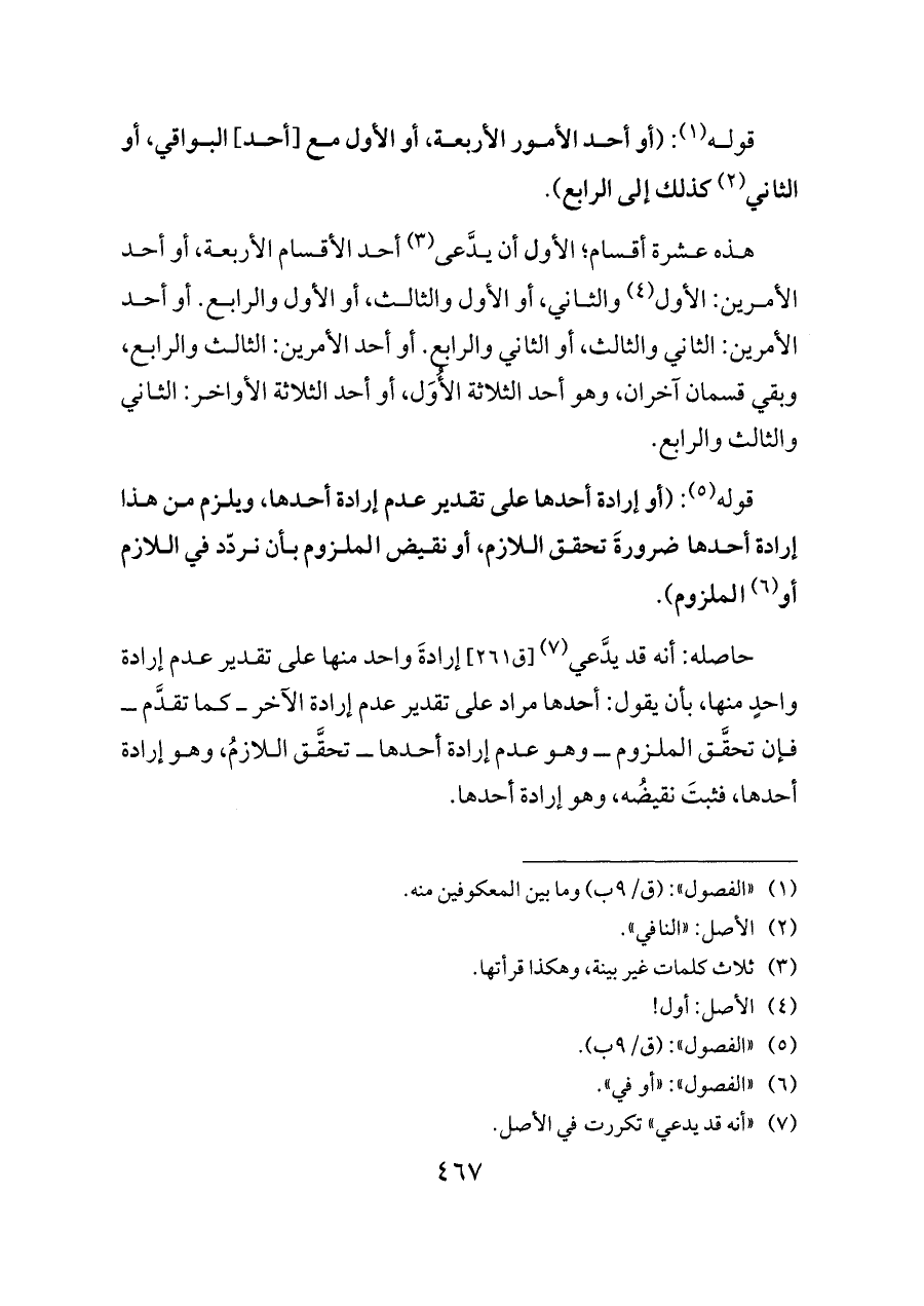 حاصله: أنه قد يدَّعي (¬٧) [ق ٢٦١] إرادةَ واحد منها على تقدير عدم إرادة واحدٍ منها، بأن يقول: أحدها مراد على تقدير عدم إرادة الآخر ــ كما تقدَّم ــ فإن تحقَّق الملزوم ــ وهو عدم إرادة أحدها ــ تحقَّق اللازمُ، وهو إرادة أحدها، فثبتَ نقيضُه، وهو إرادة أحدها.