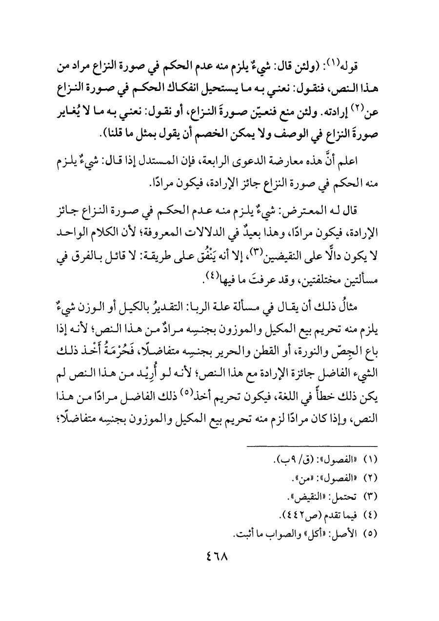 مثالُ ذلك أن يقال في مسألة علة الربا: التقديرُ بالكيل أو الوزن شيءٌ يلزم منه تحريم بيع المكيل والموزون بجنسِه مرادٌ من هذا النص؛ لأنه إذا باع الجِصّ والنورة، أو القطن والحرير بجنسِه متفاضلًا، فَحُرْمَةُ أَخْذ ذلك الشيء الفاضل جائزة الإرادة مع هذا النص؛ لأنه لو أُرِيْد من هذا النص لم يكن ذلك خطأً في اللغة، فيكون تحريم أخذ (¬٥) ذلك الفاضل مرادًا من هذا النص، وإذا كان مرادًا لزم منه تحريم بيع المكيل والموزون بجنسِه متفاضلًا؛