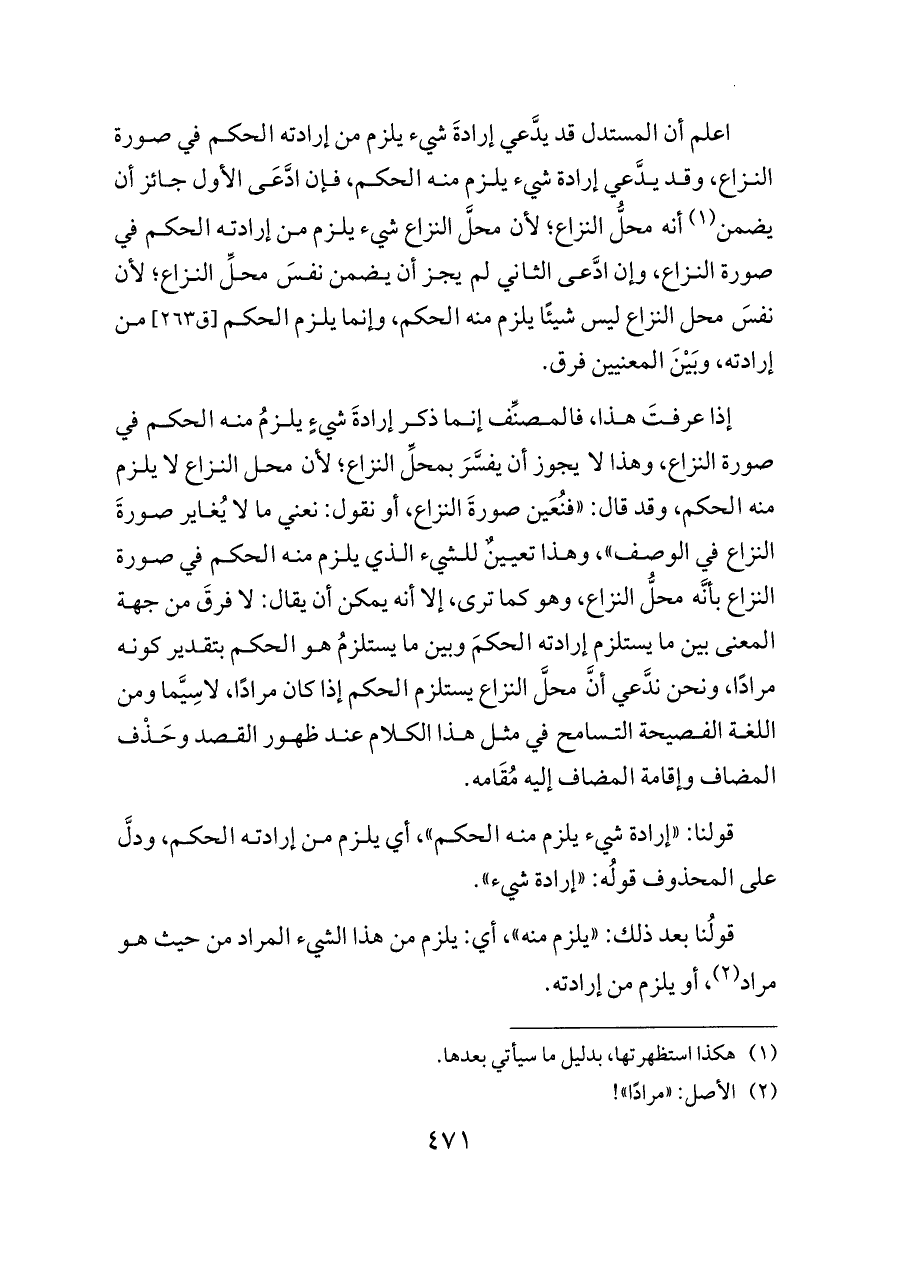 اعلم أن المستدل قد يدَّعي إرادةَ شيء يلزم من إرادته الحكم في صورة النزاع، وقد يدَّعي إرادة شيء يلزم منه الحكم، فإن ادَّعَى الأول جائز أن يضمن (¬١) أنه محلُّ النزاع؛ لأن محلَّ النزاع شيء يلزم من إرادته الحكم في صورة النزاع، وإن ادَّعى الثاني لم يجز أن يضمن نفسَ محلِّ النزاع؛ لأن نفسَ محل النزاع ليس شيئًا يلزم منه الحكم، وإنما يلزم الحكم [ق ٢٦٣] من إرادته، وبَيْنَ المعنيين فرق.