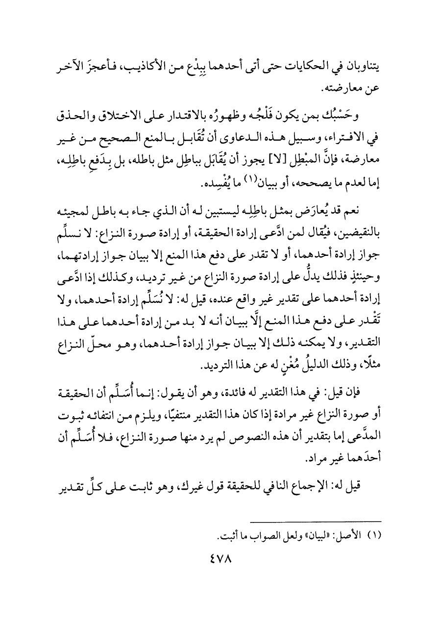 نعم قد يُعارَض بمثل باطِلِه ليستبين له أن الذي جاء به باطل لمجيئه بالنقيضين، فيُقال لمن ادَّعى إرادة الحقيقة، أو إرادة صورة النزاع: لا نسلِّم جواز إرادة أحدهما، أو لا تقدر على دفع هذا المنع إلا ببيان جواز إرادتهما، وحينئذٍ فذلك يدلُّ على إرادة صورة النزاع من غير ترديد، وكذلك إذا ادَّعى إرادة أحدهما على تقدير غير واقع عنده، قيل له: لا نُسَلِّم إرادة أحدهما، ولا تَقْدر على دفع هذا المنع إلَّا ببيان أنه لا بد من إرادة أحدهما على هذا التقدير، ولا يمكنه ذلك إلا ببيان جواز إرادة أحدهما، وهو محلّ النزاع مثلًا، وذلك الدليلُ مُغْنٍ له عن هذا الترديد.