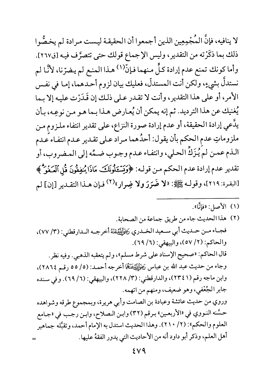 لا ينافيه، فإنَّ المُجْمِعِين الذين أجمعوا أن الحقيقة ليست مرادة لم يخصُّوا ذلك بما ذكَرْته من التقدير، وليس الإجماع قولك حتى تتصرَّف فيه [ق ٢٦٧]. وأما كونك تمنع عدم إرادة كلٍّ منهما فإنّ (¬١) هذا المنع لم يضرّنا، لأنَّا لم نستدلَّ بشيءٍ، ولكن أنت المستدلّ، فعليك بيان لزوم أحدهما، إما في نفس الأمر، أو على هذا التقدير، وأنت لا تقدر على ذلك إن قَدَرْت عليه إلا بما يُغنيك عن هذا الترديد. ثم إنه يمكن أن يُعارض هذا بما هو من نوعِه، بأن يدَّعي إرادة الحقيقة، أو عدم إرادة صورة النزاع، على تقدير انتفاء ملزومٍ من ملزوماتِ عدمِ الحكم بأن يقول: أحدُهما مراد على تقدير عدم انتفاء عدم الذم عمن لم يُزَكِّ الحلي، وانتفاء عدم وجوب ضمِّه إلى المضروب، أو تقدير عدم إرادة عدم الحكم من قوله: {وَيَسْأَلُونَكَ مَاذَا يُنْفِقُونَ قُلِ الْعَفْوَ} [البقرة: ٢١٩]، وقوله - صلى الله عليه وسلم -: «لا ضَرَرَ ولا ضِرار» (¬٢)