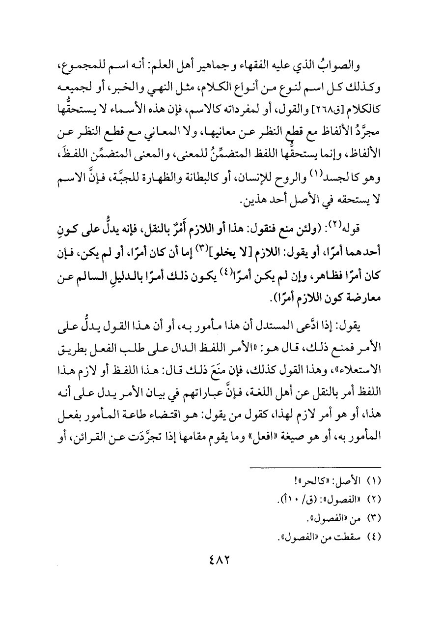 يقول: إذا ادَّعى المستدل أن هذا مأمور به، أو أن هذا القول يدلُّ على الأمر فمنع ذلك، قال هو: «الأمر اللفظ الدال على طلب الفعل بطريق الاستعلاء»، وهذا القول كذلك، فإن منَعَ ذلك قال: هذا اللفظ أو لازم هذا اللفظ أمر بالنقل عن أهل اللغة، فإنَّ عباراتهم في بيان الأمر يدل على أنه هذا، أو هو أمر لازم لهذا، كقول من يقول: هو اقتضاء طاعة المأمور بفعل المأمور به، أو هو صيغة «افعل» وما يقوم مقامها إذا تجرَّدَت عن القرائن، أو