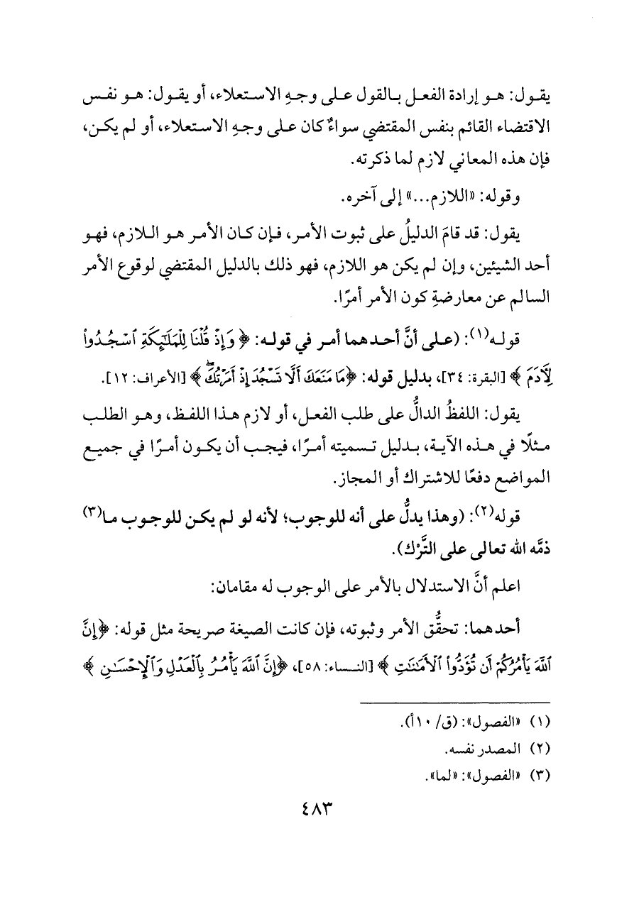 يقول: قد قامَ الدليلُ على ثبوت الأمر، فإن كان الأمر هو اللازم، فهو أحد الشيئين، وإن لم يكن هو اللازم، فهو ذلك بالدليل المقتضي لوقوع الأمر السالم عن معارضةِ كون الأمر أمرًا.