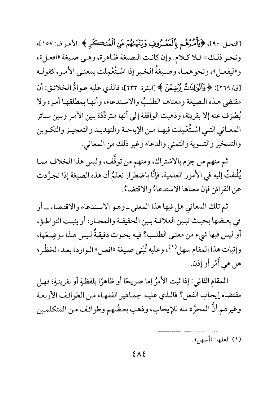 ثم تلك المعاني هل فيها هذا المعنى ــ وهو الاستدعاء والاقتضاء ــ أو في بعضها بحيث تبين العلاقة بين الحقيقة والمجاز، أو يثبت التواطؤ، أو ليس فيها شيء من معنى الطلب؟ فيه بحوث دقيقةٌ ليس هذا موضِعَها، وإثبات هذا المقام سهل (¬١)، وعليه تُبْنى صيغة «افعل» الواردة بعد الحَظْر؛ هل هي أَمْر أو إذن.