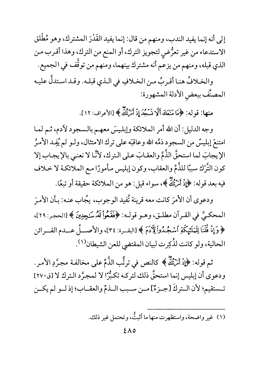 ودعوى أن الأمرَ كانت معه قرينة تُفيد الوجوب، يُجاب عنه: بأن الأمرَ المحكيَّ في القرآن مطلق، وهو قوله: {فَقَعُوا لَهُ سَاجِدِينَ} [الحجر: ٢٩]، {وَإِذْ قُلْنَا لِلْمَلَائِكَةِ اسْجُدُوا لِآدَمَ} [البقرة: ٣٤]، والأصلُ عدم القرائن الحالية، ولو كانت لذُكِرت لبيان المقتضي للعن الشيطان (¬١).