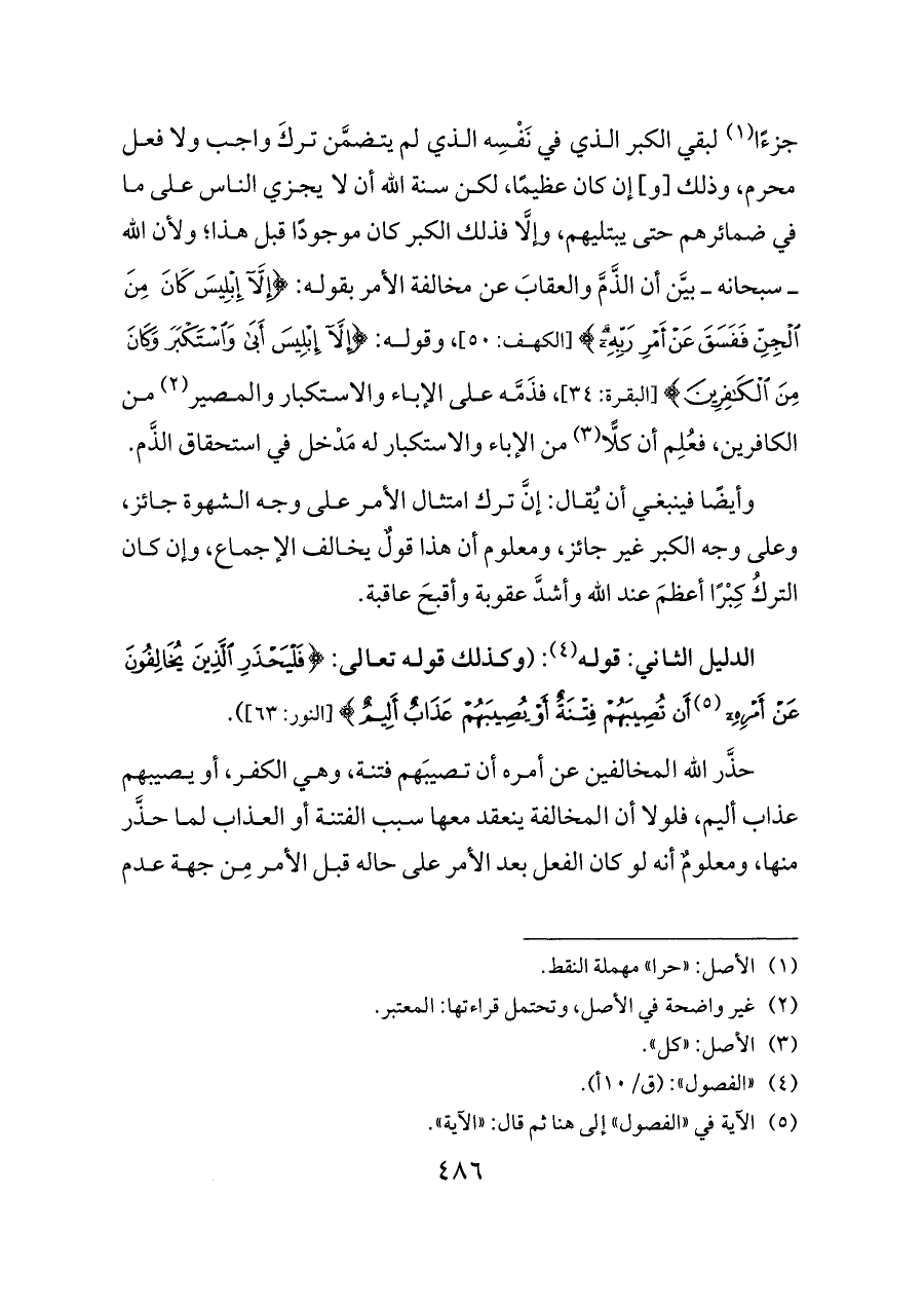 جزءًا (¬١) لبقي الكبر الذي في نَفْسِه الذي لم يتضمَّن تركَ واجب ولا فعل محرم، وذلك [و] إن كان عظيمًا، لكن سنة الله أن لا يجزي الناس على ما في ضمائرهم حتى يبتليهم، وإلَّا فذلك الكبر كان موجودًا قبل هذا؛ ولأن الله ــ سبحانه ــ بيَّن أن الذَّمَّ والعقابَ عن مخالفة الأمر بقوله: {إِلَّا إِبْلِيسَ كَانَ مِنَ الْجِنِّ فَفَسَقَ عَنْ أَمْرِ رَبِّهِ} [الكهف: ٥٠]، وقوله: {إِلَّا إِبْلِيسَ أَبَى وَاسْتَكْبَرَ وَكَانَ مِنَ الْكَافِرِينَ} [البقرة: ٣٤]، فذَمَّه على الإباء والاستكبار والمصير (¬٢) من الكافرين، فعُلِم أن كلًّا (¬٣) من الإباء والاستكبار له مَدْخل في استحقاق الذَّم.