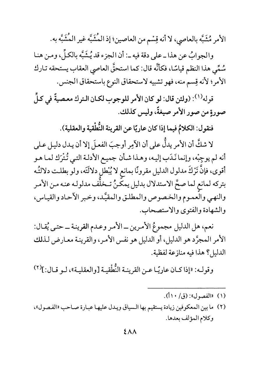 فنقول: الكلامُ فيما إذا كان عاريًا عن القرينة النُّطْقية والعقلية).