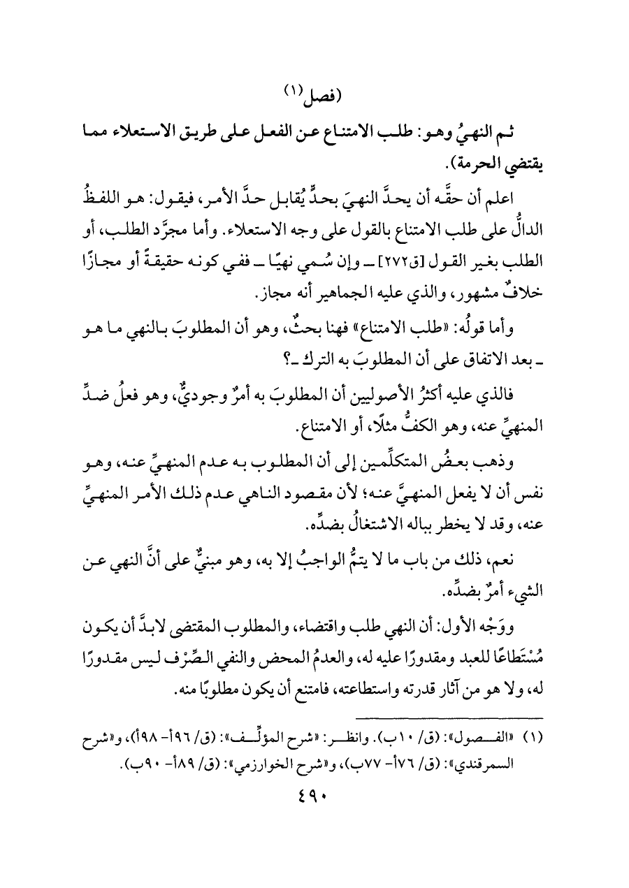 (¬١) «الفصول»: (ق/١٠ ب). وانظر: «شرح المؤلِّف»: (ق/٩٦ أ- ٩٨ أ)، و «شرح السمرقندي»: (ق/٧٦ أ- ٧٧ ب)، و «شرح الخوارزمي»: (ق/٨٩ أ- ٩٠ ب).