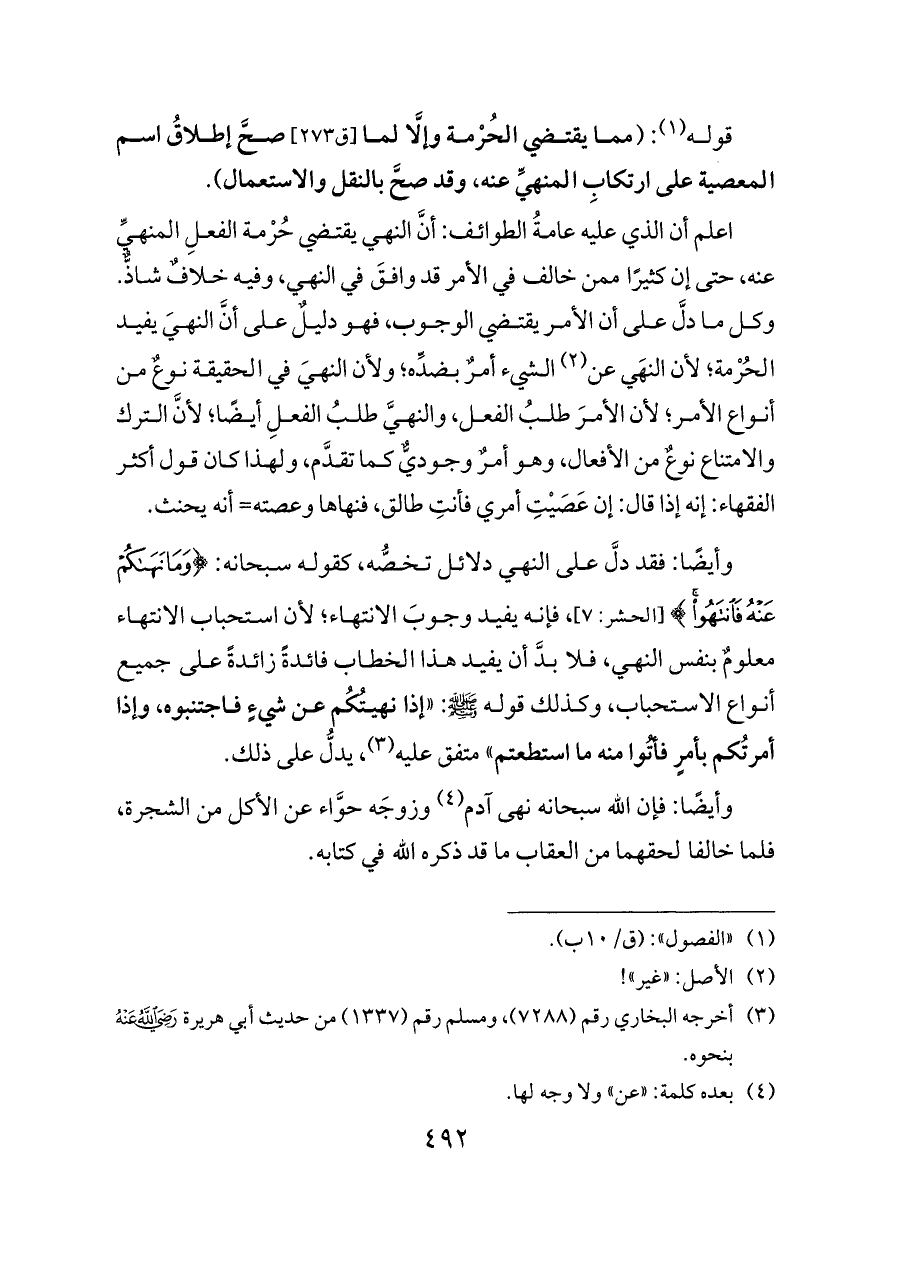 قوله (¬١): (مما يقتضي الحُرْمة وإلَّا لما [ق ٢٧٣] صحَّ إطلاقُ اسم المعصية على ارتكابِ المنهيِّ عنه، وقد صحَّ بالنقل والاستعمال).
