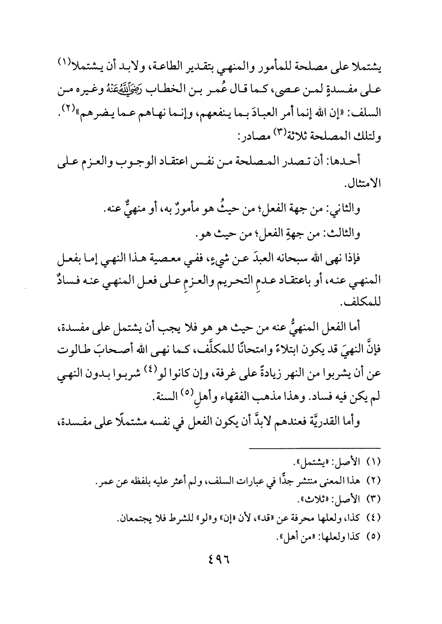 يشتملا على مصلحة للمأمور والمنهي بتقدير الطاعة، ولابد أن يشتملا (¬١) على مفسدةٍ لمن عصى، كما قال عُمر بن الخطاب - رضي الله عنه - وغيره من السلف: «إن الله إنما أمر العبادَ بما ينفعهم، وإنما نهاهم عما يضرهم» (¬٢). ولتلك المصلحة ثلاثة (¬٣) مصادر: