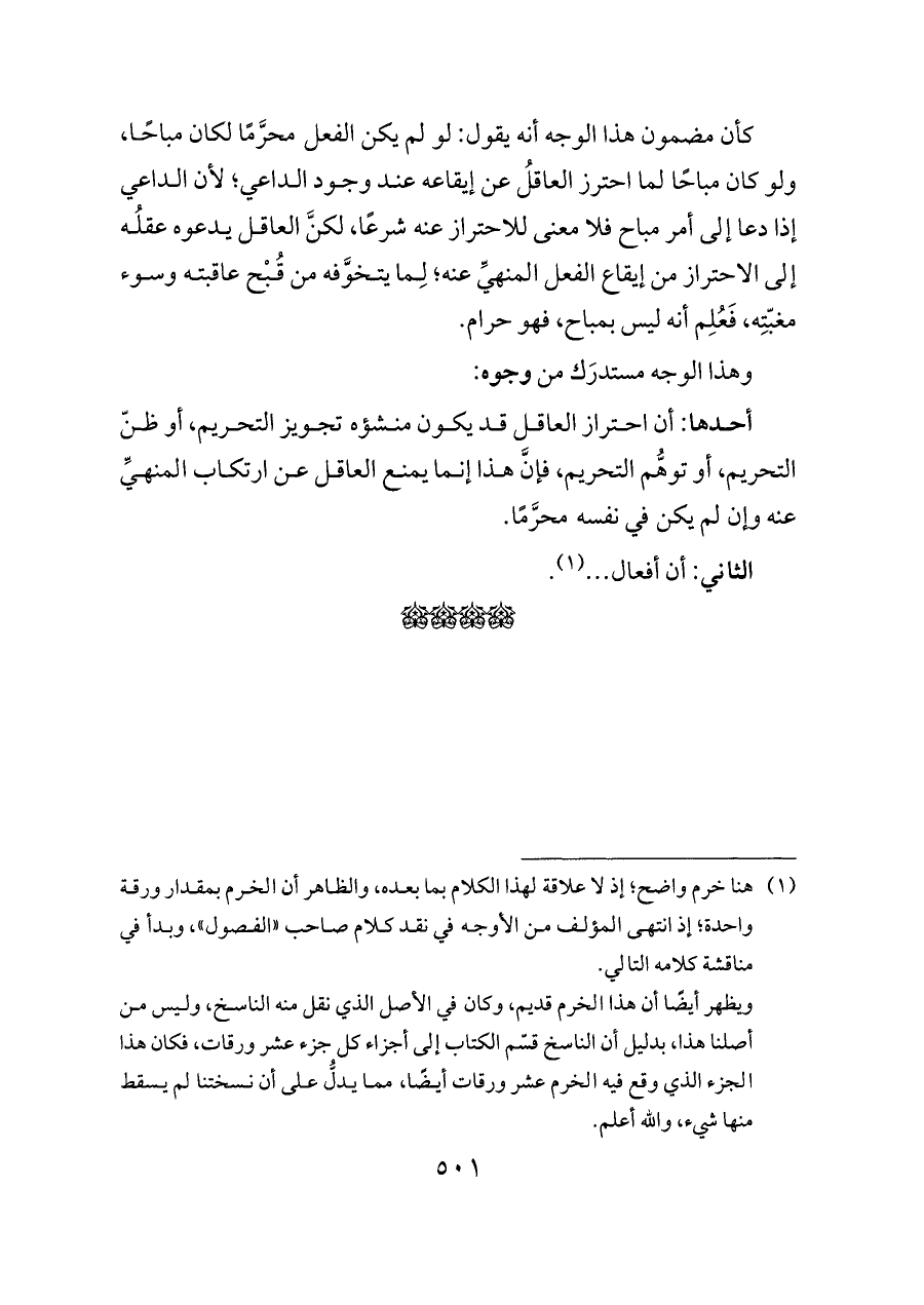(¬١) هنا خرم واضح؛ إذ لا علاقة لهذا الكلام بما بعده، والظاهر أن الخرم بمقدار ورقة واحدة؛ إذ انتهى المؤلف من الأوجه في نقد كلام صاحب «الفصول»، وبدأ في مناقشة كلامه التالي.