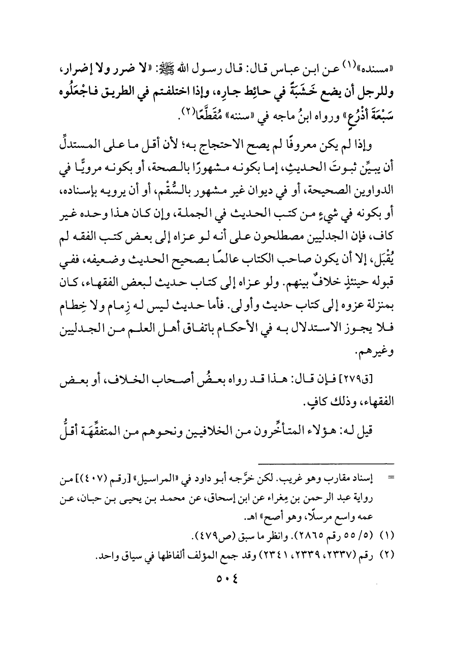 وإذا لم يكن معروفًا لم يصح الاحتجاج به؛ لأن أقل ما على المستدلِّ أن يبيِّن ثبوتَ الحديثِ، إما بكونه مشهورًا بالصحة، أو بكونه مرويًّا في الدواوين الصحيحة، أو في ديوان غير مشهور بالسُّقْم، أو أن يرويه بإسناده، أو بكونه في شيءٍ من كتب الحديث في الجملة، وإن كان هذا وحده غير كاف، فإن الجدليين مصطلحون على أنه لو عزاه إلى بعض كتب الفقه لم يُقْبَل، إلا أن يكون صاحب الكتاب عالمًا بصحيح الحديث وضعيفه، ففي قبوله حينئذٍ خلافٌ بينهم. ولو عزاه إلى كتاب حديث لبعض الفقهاء، كان بمنزلة عزوه إلى كتاب حديث وأولى. فأما حديث ليس له زِمام ولا خِطام فلا يجوز الاستدلال به في الأحكام باتفاق أهل العلم من الجدليين وغيرهم.