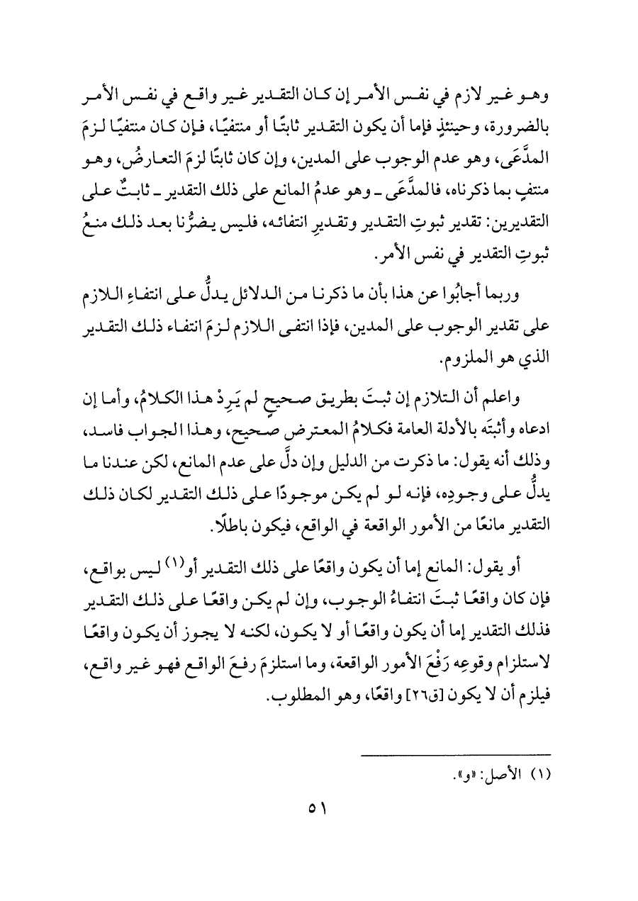 وهو غير لازم في نفس الأمر إن كان التقدير غير واقع في نفس الأمر بالضرورة، وحينئذٍ فإما أن يكون التقدير ثابتًا أو منتفيًا، فإن كان منتفيًا لزمَ المدَّعَى، وهو عدم الوجوب على المدين، وإن كان ثابتًا لزمَ التعارضُ، وهو منتفٍ بما ذكرناه، فالمدَّعَى ــ وهو عدمُ المانع على ذلك التقدير ــ ثابتٌ على التقديرين: تقدير ثبوتِ التقدير وتقديرِ انتفائه، فليس يضرُّنا بعد ذلك منعُ ثبوتِ التقدير في نفس الأمر.