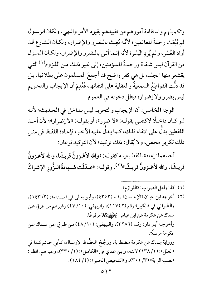 الوجه الخامس: أن الإيجاب والتحريم ليس بداخل في الحديث؛ لأنه لو كان داخلًا لاكتفى بقوله: «لا ضرر»، أو بقوله: «لا إضرار»؛ لأن أحد اللفظين يدلُّ على انتفاء ذلك، كما يدلُّ عليه الآخر، فإعادة اللفظ في مثل ذلك تكرير محض، ولا يُقال: ذلك توكيد؛ لأن التوكيد نوعان: