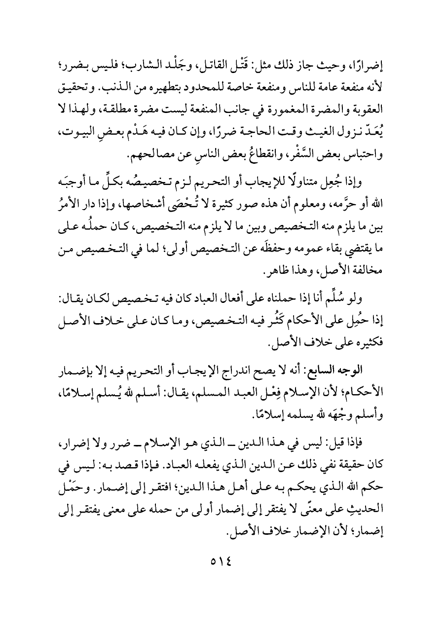 الوجه السابع: أنه لا يصح اندراج الإيجاب أو التحريم فيه إلا بإضمار الأحكام؛ لأن الإسلام فِعْل العبد المسلم، يقال: أسلم لله يُسلم إسلامًا، وأسلم وجْهَه لله يسلمه إسلامًا.